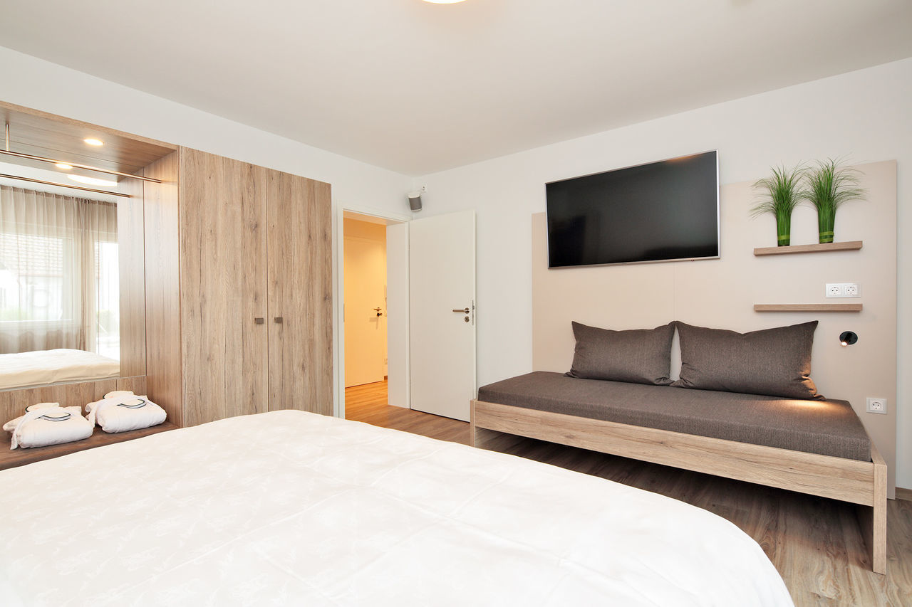 Auf Wunsch können die Doppelbetten auch getrennt und als Einzelbetten genutzt werden. Das Zustellen eines weiteren Kinderbetts ist natürlich möglich.